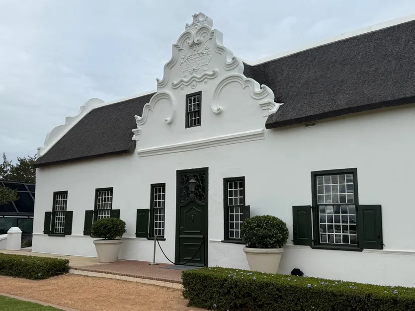 CAREFULLY RESTORED 18TH CENTURY CAPE DUTCH BUILDING AT VERGENOEGD WITH DYLAN LEWIS ART IN THE FOREGROUND.